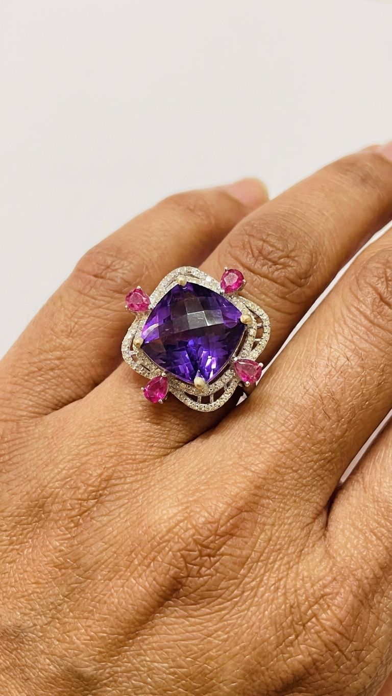 This Amethyst Ruby Ring is handcrafted in hallmarked 92.5 sterling silver, set with a natural certified amethist gemstone (0.35 ct). Weighing 6.07g, it is part of our Rings collection, made at our Jaipur workshop by skilled artisans who carry forward generations of traditional silversmithing technique.