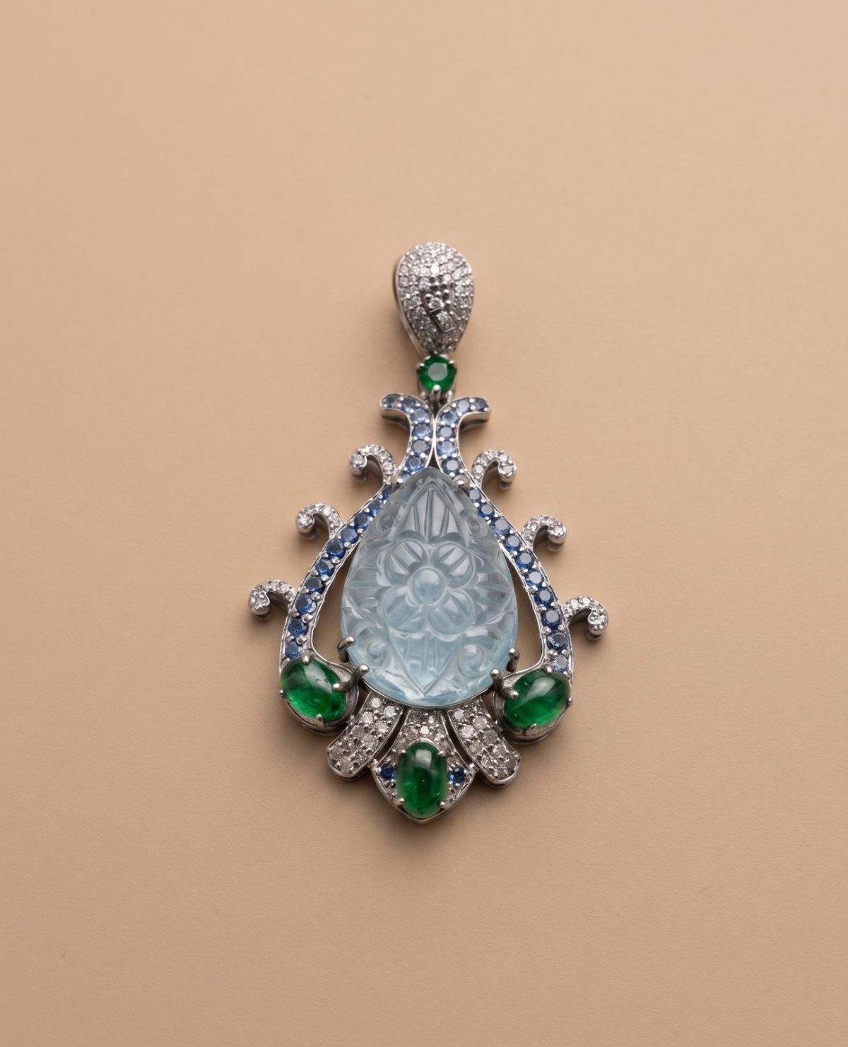 This Aquamarine Tsavorite Pendant is handcrafted in hallmarked 92.5 sterling silver, set with a natural certified aquamarine gemstone (1.05 ct). Weighing 6.3g, it is part of our Pendants collection, made at our Jaipur workshop by skilled artisans who carry forward generations of traditional silversmithing technique.