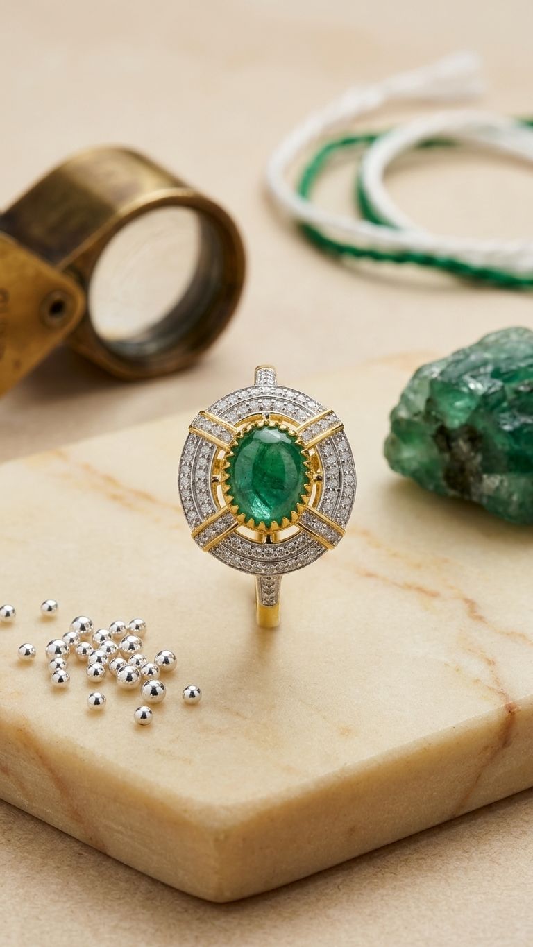 This Emerald Ring is handcrafted in hallmarked 92.5 sterling silver, set with a natural certified emerald gemstone (0.43 ct). Weighing 4.284g, it is part of our Rings collection, made at our Jaipur workshop by skilled artisans who carry forward generations of traditional silversmithing technique.