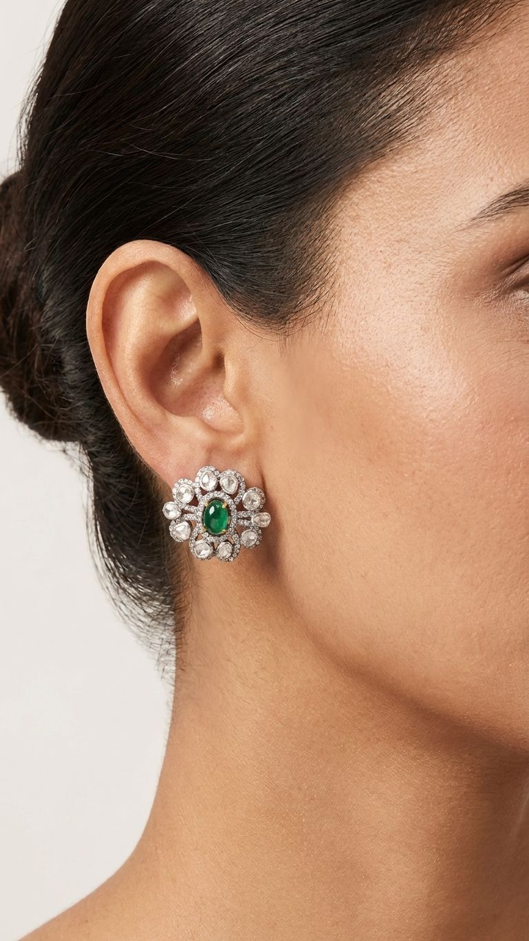 This Emerald Stud is handcrafted in hallmarked 92.5 sterling silver, set with a natural certified emerald gemstone (1.47 ct). Weighing 5.592g, it is part of our Studs collection, made at our Jaipur workshop by skilled artisans who carry forward generations of traditional silversmithing technique.
