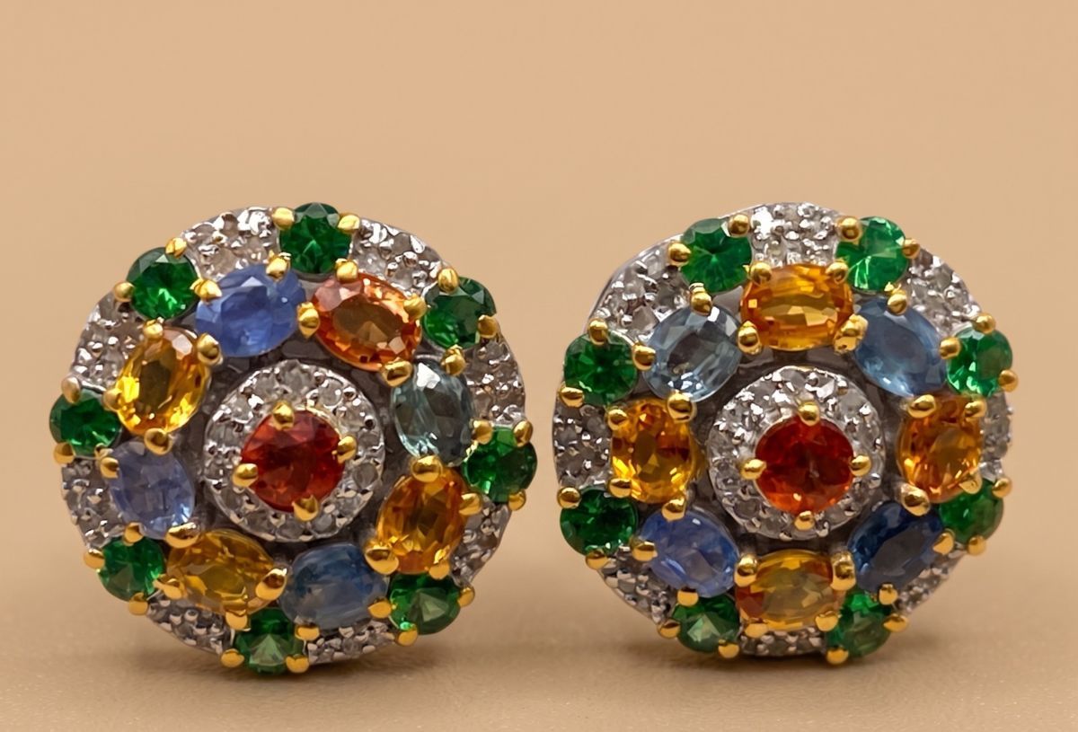 This Multi sapphire Tsavorite Stud is handcrafted in hallmarked 92.5 sterling silver, set with a natural certified malti shaphire gemstone (0.55 ct). Weighing 5.5g, it is part of our Studs collection, made at our Jaipur workshop by skilled artisans who carry forward generations of traditional silversmithing technique.